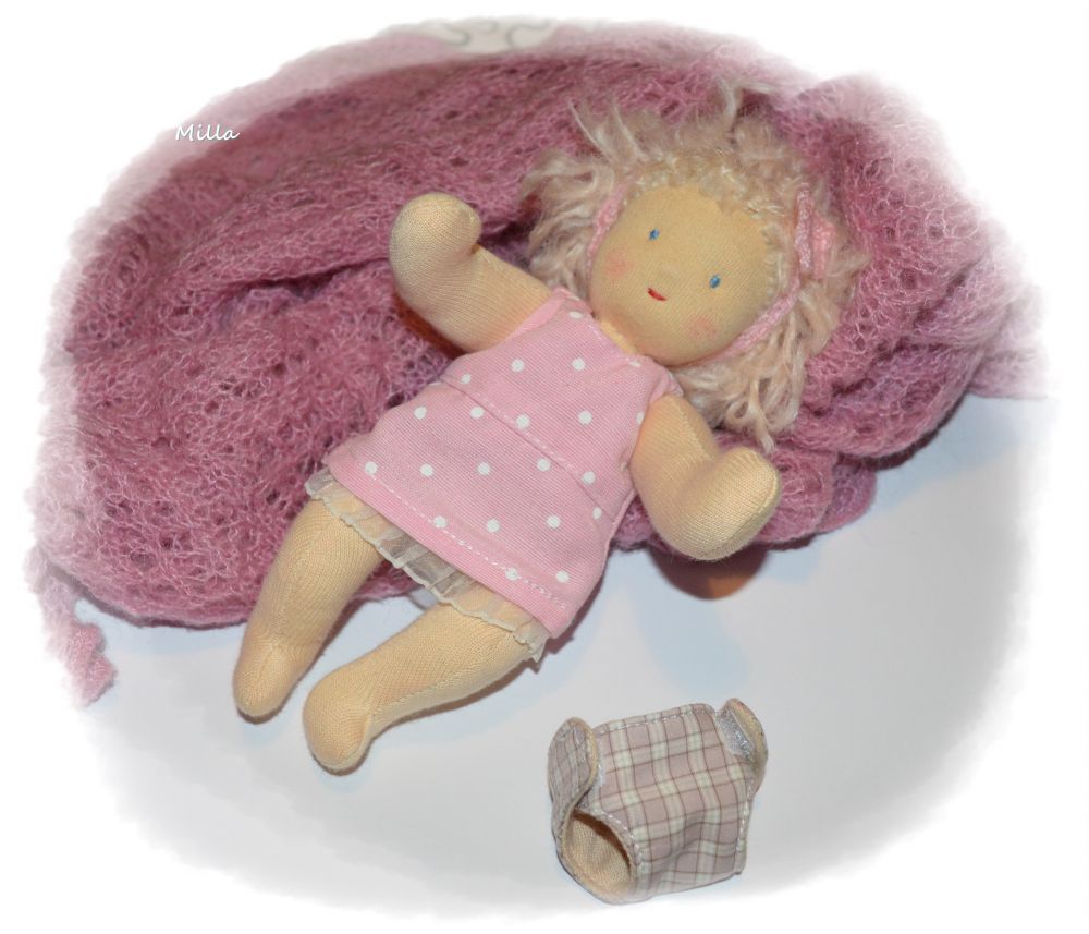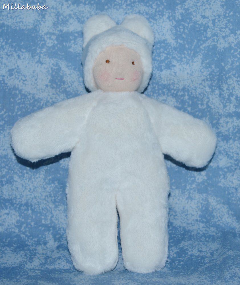 A feje a testének a negyede. A babák csak természetes anyagokból készülnek, pamutból és gyapjúból. A babák egész teste gyapjúval van kitömve. Hajuk moher-gyapjú vagy gyapjú fonalból készülnek, kézzel formázhatók. A Waldorf- elmé-let szerint a gyermekek a saját érzelmeiket vetítik a babákra, önmagukat látják bennük. Ezért tűnik elsőre kidolgozatlannak a babák arca. Nagy képze-lőerejükkel könnyen képzelnek örömet vagy bánatot az arcvonások mögé.